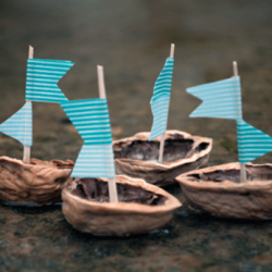 Pihenésképpen pedig dióhéjfigurákat készítettünk. A dióhéj kiváló kis játékok készítésére: a vitorláshoz viaszgyertyát olvasztottunk, ebbe fogpiszkáló került, majd papírból készítettük el a vitorlát. Ezt készíthetjük dekortapaszból is. Ha a viaszt kb. 2/3 részig töltöd a dióhéjba, akkor a kis hajócska úszik a vízen is.